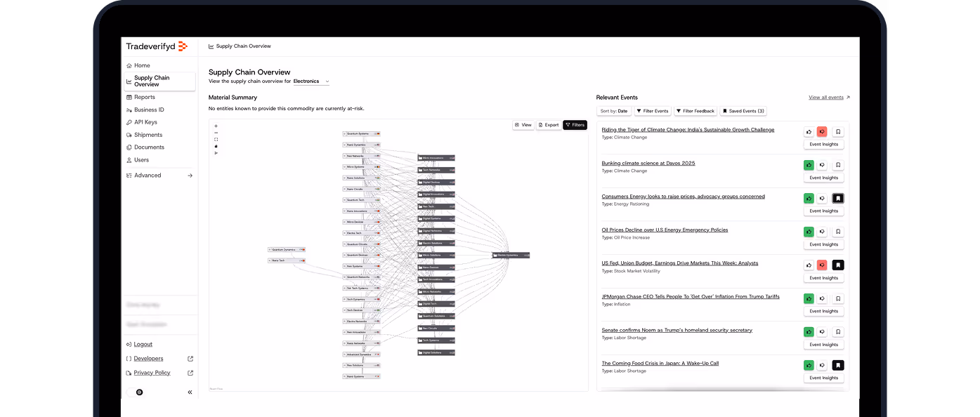 Tradeverifyd’s industry-leading multi-tier mapping reveals every supplier relationship — from finished goods to raw inputs — so you can uncover hidden risk and move with confidence.