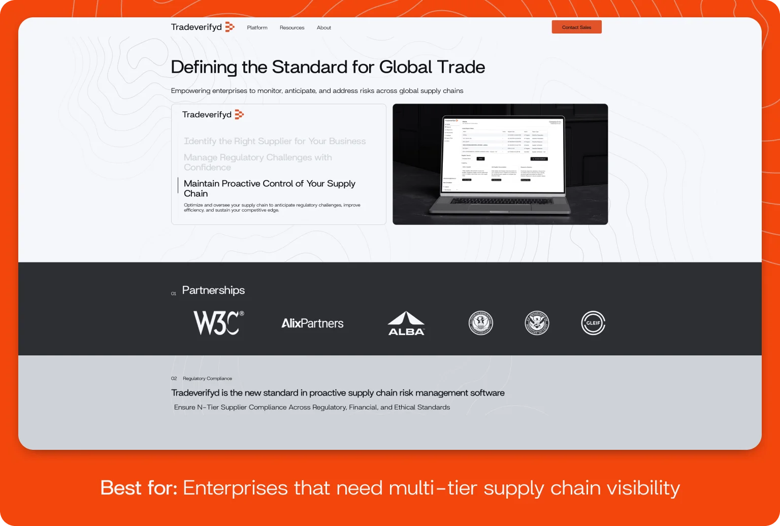 Altogether, Tradeverifyd's focus is resilience: its combination of mapping, scoring, monitoring, and compliance helps you withstand disruptions and reduce risk exposure. That’s why Tradeverifyd is an excellent choice among global supply chain management solutions.