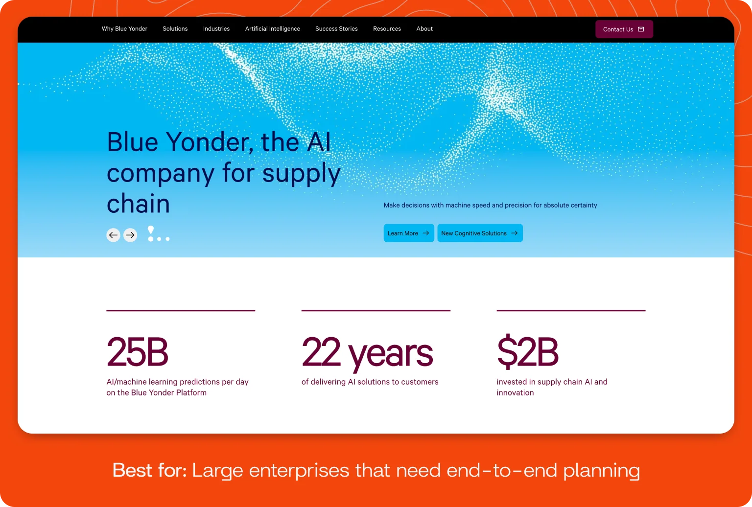 Blue Yonder provides an enterprise-scale supply chain platform focused on end-to-end planning — including demand, supply, and inventory optimization, plus production and disruption prevention. This is done through the integration of artificial intelligence and machine learning (AI/ML) in the cloud, which helps improve both accuracy and resilience.