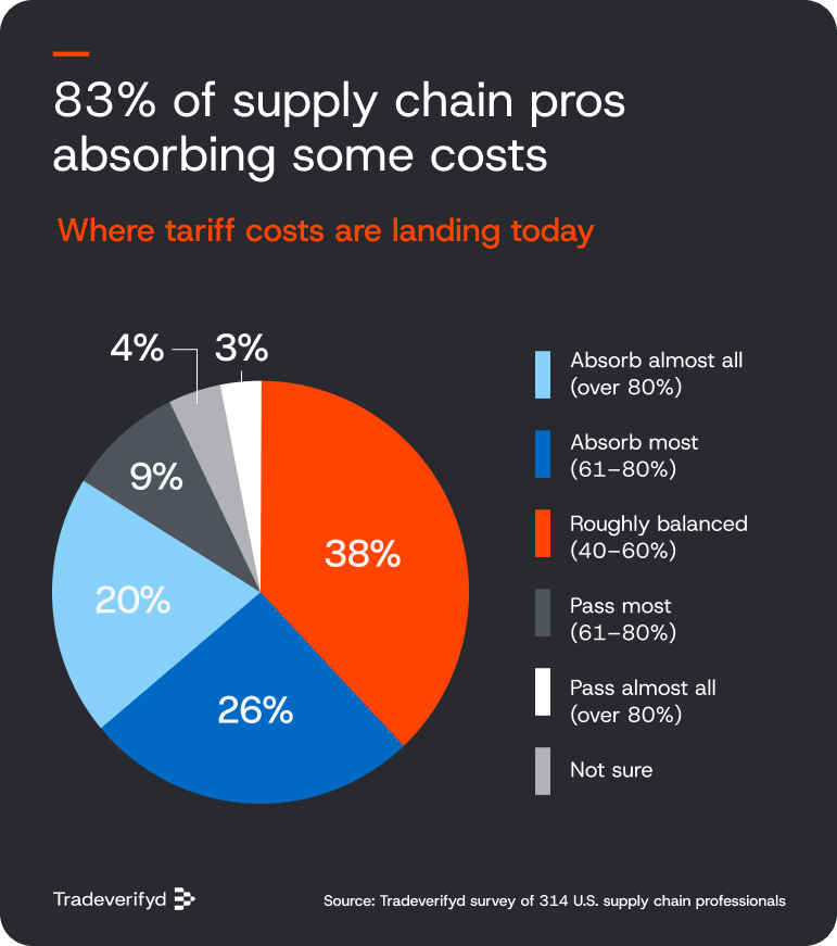 While some companies are beginning to balance tariff costs between margins and pricing decisions, full pass-through still remains relatively uncommon across supply chains today. Nearly half (46%) of executives say their organizations are absorbing most or nearly all of tariff costs. Only 12% are currently passing costs to consumers.