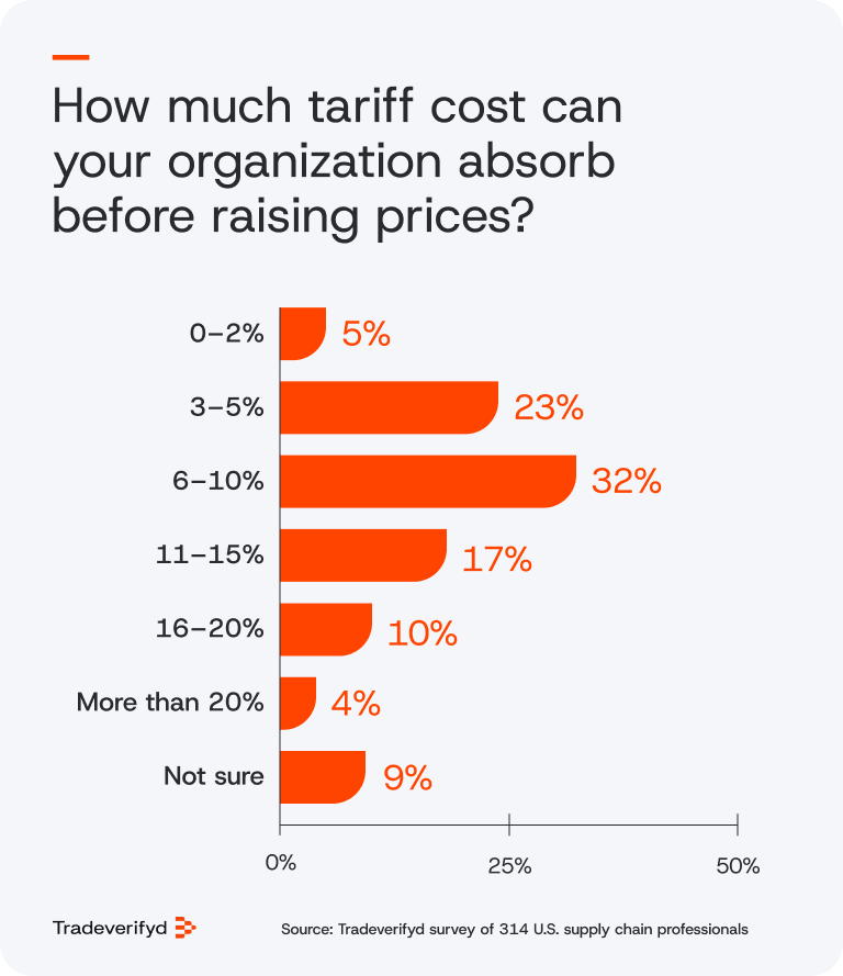 The majority (59%) of supply chain leaders say their organizations can absorb tariff cost increases of up to 10% before raising prices, reinforcing how quickly higher tariffs can translate into downstream pricing pressure.