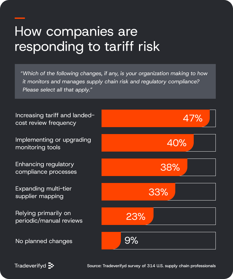Nearly half (47%) of executives say their organizations are responding by increasing how often they do tariff and landed-cost reviews, as tariff exposure shifts upstream.