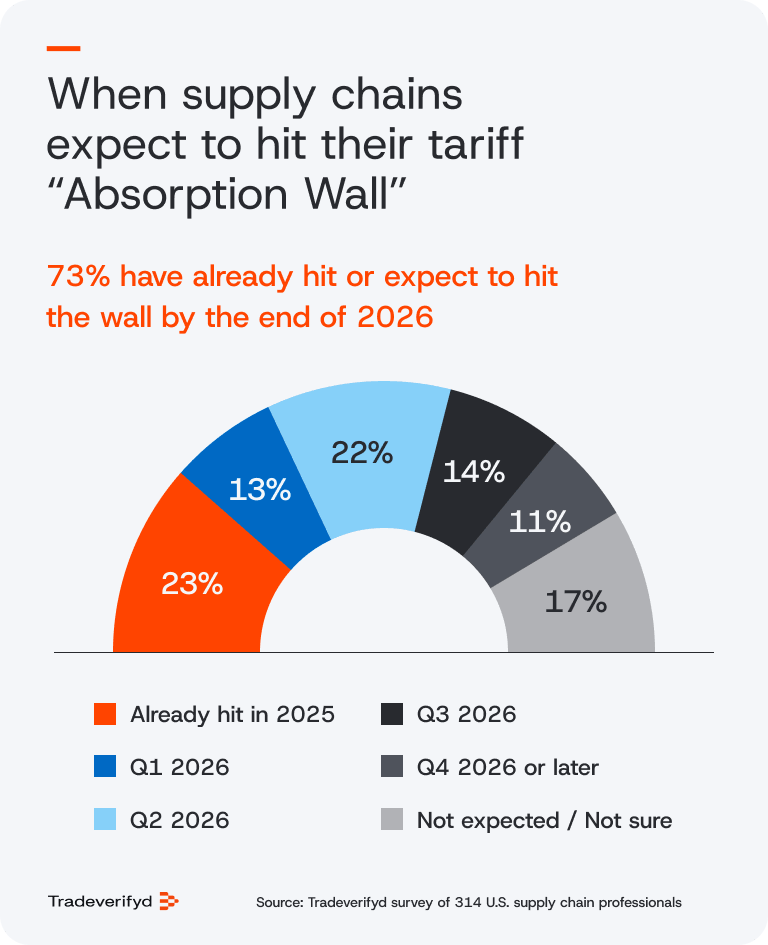 Nearly 3 in 4 (73%) executives say their organizations have already hit or expect to hit their absorption wall by the end of 2026, indicating that unless trade pressures subside, additional tariff costs will likely reach customers soon.